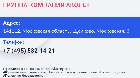ГРУППА КОМПАНИЙ АКОЛЕТ по адресу 141112, Московская область, Щёлково, Московская, 3 в дальнейшем Организация, размещена в следующих категориях: