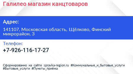 Галилео, магазин канцтоваров по адресу 141107, Московская область, Щёлково, Финский микрорайон, 3 в дальнейшем Организация, размещена в следующих категориях: