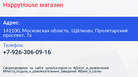 HappyHouse, магазин по адресу 141100, Московская область, Щёлково, Пролетарский проспект, 7а в дальнейшем Организация, размещена в следующих категориях: