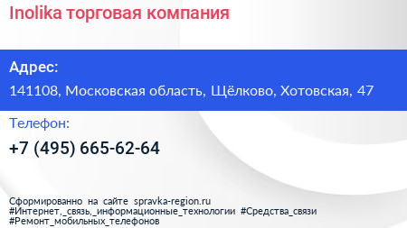 Inolika, торговая компания по адресу 141108, Московская область, Щёлково, Хотовская, 47 в дальнейшем Организация, размещена в следующих категориях: