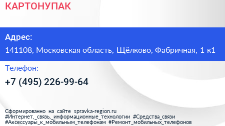 КАРТОНУПАК по адресу 141108, Московская область, Щёлково, Фабричная, 1 к1 в дальнейшем Организация, размещена в следующих категориях: