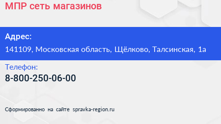 МПР, сеть магазинов по адресу 141109, Московская область, Щёлково, Талсинская, 1а в дальнейшем Организация, размещена в следующих категориях: