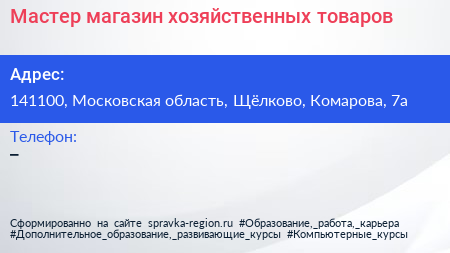 Мастер, магазин хозяйственных товаров по адресу 141100, Московская область, Щёлково, Комарова, 7а в дальнейшем Организация, размещена в следующих категориях: