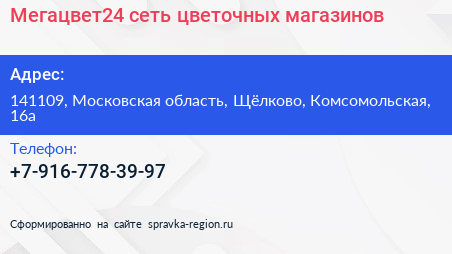 Мегацвет24, сеть цветочных магазинов по адресу 141109, Московская область, Щёлково, Комсомольская, 16а в дальнейшем Организация, размещена в следующих категориях: