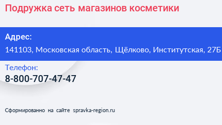 Подружка, сеть магазинов косметики по адресу 141103, Московская область, Щёлково, Институтская, 27Б в дальнейшем Организация, размещена в следующих категориях: