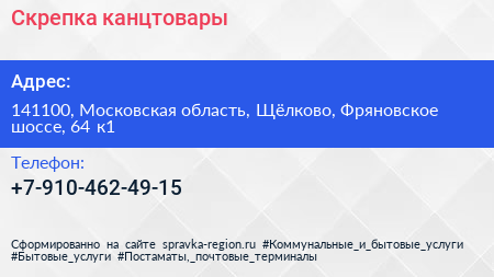 Скрепка, канцтовары по адресу 141100, Московская область, Щёлково, Фряновское шоссе, 64 к1 в дальнейшем Организация, размещена в следующих категориях: