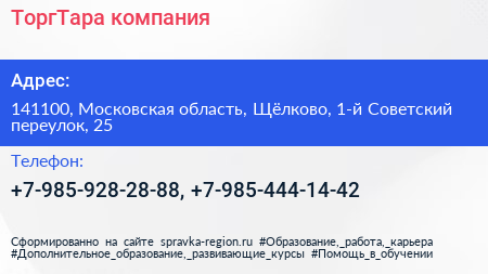 ТоргТара, компания по адресу 141100, Московская область, Щёлково, 1-й Советский переулок, 25 в дальнейшем Организация, размещена в следующих категориях: