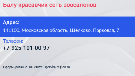 Балу красавчик, сеть зоосалонов по адресу 141100, Московская область, Щёлково, Парковая, 7 в дальнейшем Организация, размещена в следующих категориях: