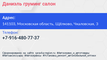 Даниэль, груминг-салон по адресу 141103, Московская область, Щёлково, Чкаловская, 3 в дальнейшем Организация, размещена в следующих категориях: