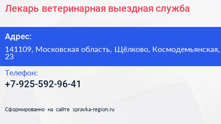 Лекарь, ветеринарная выездная служба по адресу 141109, Московская область, Щёлково, Космодемьянская, 23 в дальнейшем Организация, размещена в следующих категориях: