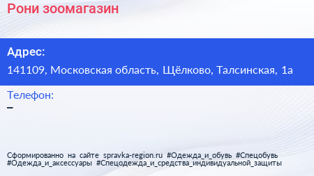 Рони, зоомагазин по адресу 141109, Московская область, Щёлково, Талсинская, 1а в дальнейшем Организация, размещена в следующих категориях: