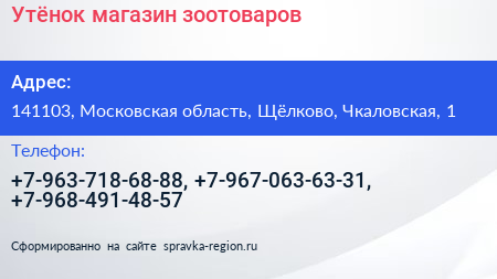 Утёнок, магазин зоотоваров по адресу 141103, Московская область, Щёлково, Чкаловская, 1 в дальнейшем Организация, размещена в следующих категориях: