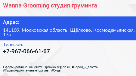 Wanna Grooming?, студия груминга по адресу 141109, Московская область, Щёлково, Космодемьянская, 17а в дальнейшем Организация, размещена в следующих категориях: