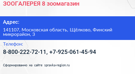 ЗООГАЛЕРЕЯ 8, зоомагазин по адресу 141107, Московская область, Щёлково, Финский микрорайон, 3 в дальнейшем Организация, размещена в следующих категориях: