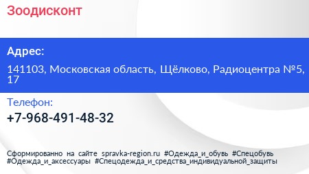 Зоодисконт по адресу 141103, Московская область, Щёлково, Радиоцентра №5, 17 в дальнейшем Организация, размещена в следующих категориях: