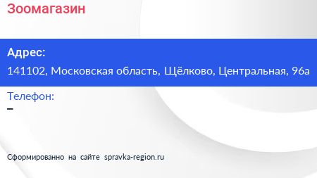 Зоомагазин по адресу 141102, Московская область, Щёлково, Центральная, 96а в дальнейшем Организация, размещена в следующих категориях: