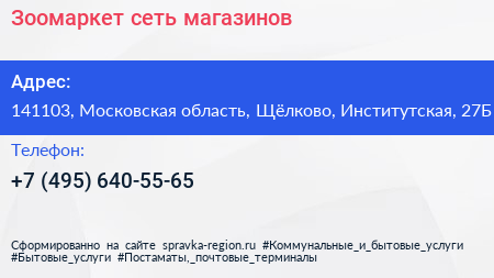 Зоомаркет, сеть магазинов по адресу 141103, Московская область, Щёлково, Институтская, 27Б в дальнейшем Организация, размещена в следующих категориях: