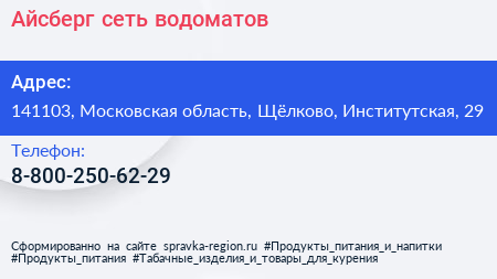 Айсберг, сеть водоматов по адресу 141103, Московская область, Щёлково, Институтская, 29 в дальнейшем Организация, размещена в следующих категориях: