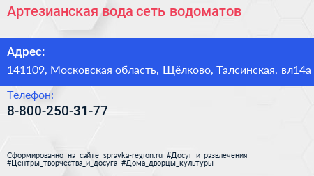 Артезианская вода, сеть водоматов по адресу 141109, Московская область, Щёлково, Талсинская, вл14а в дальнейшем Организация, размещена в следующих категориях: