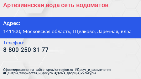 Артезианская вода, сеть водоматов по адресу 141100, Московская область, Щёлково, Заречная, вл5а в дальнейшем Организация, размещена в следующих категориях: