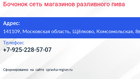 Бочонок, сеть магазинов разливного пива по адресу 141109, Московская область, Щёлково, Комсомольская, 8в в дальнейшем Организация, размещена в следующих категориях: