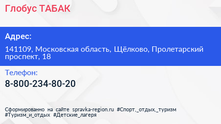 Глобус ТАБАК по адресу 141109, Московская область, Щёлково, Пролетарский проспект, 18 в дальнейшем Организация, размещена в следующих категориях: