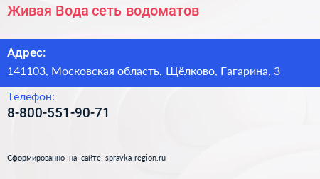 Живая Вода, сеть водоматов по адресу 141103, Московская область, Щёлково, Гагарина, 3 в дальнейшем Организация, размещена в следующих категориях: