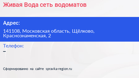 Живая Вода, сеть водоматов по адресу 141108, Московская область, Щёлково, Краснознаменская, 2 в дальнейшем Организация, размещена в следующих категориях: