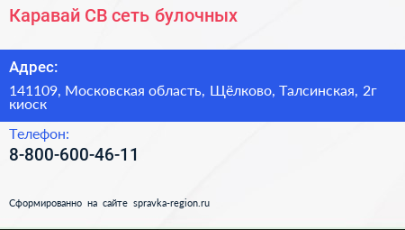 Каравай СВ, сеть булочных по адресу 141109, Московская область, Щёлково, Талсинская, 2г киоск в дальнейшем Организация, размещена в следующих категориях: