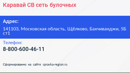 Каравай СВ, сеть булочных по адресу 141103, Московская область, Щёлково, Бахчиванджи, 5Б ст1 в дальнейшем Организация, размещена в следующих категориях: