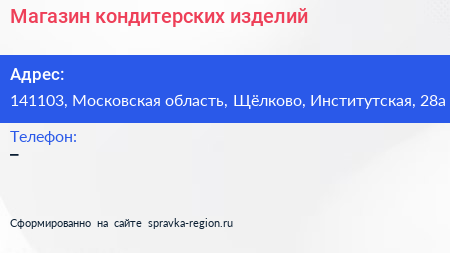 Магазин кондитерских изделий по адресу 141103, Московская область, Щёлково, Институтская, 28а в дальнейшем Организация, размещена в следующих категориях: