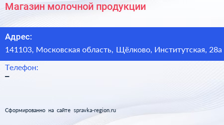 Магазин молочной продукции по адресу 141103, Московская область, Щёлково, Институтская, 28а в дальнейшем Организация, размещена в следующих категориях: