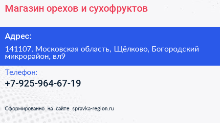 Магазин орехов и сухофруктов по адресу 141107, Московская область, Щёлково, Богородский микрорайон, вл9 в дальнейшем Организация, размещена в следующих категориях: