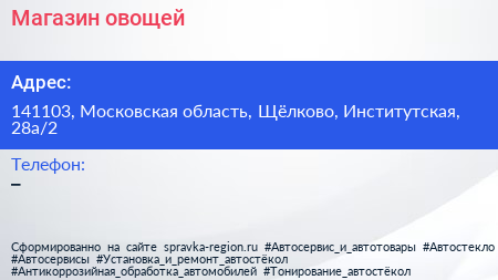 Магазин овощей по адресу 141103, Московская область, Щёлково, Институтская, 28а/2 в дальнейшем Организация, размещена в следующих категориях: