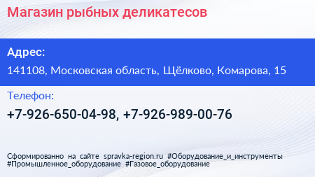 Магазин рыбных деликатесов по адресу 141108, Московская область, Щёлково, Комарова, 15 в дальнейшем Организация, размещена в следующих категориях: