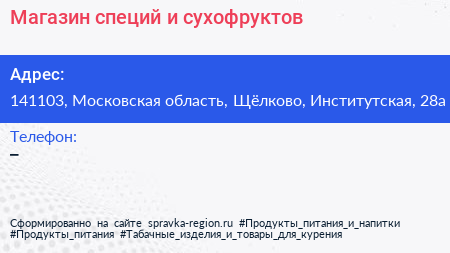 Магазин специй и сухофруктов по адресу 141103, Московская область, Щёлково, Институтская, 28а в дальнейшем Организация, размещена в следующих категориях: