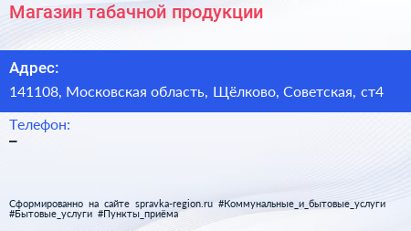 Магазин табачной продукции по адресу 141108, Московская область, Щёлково, Советская, ст4 в дальнейшем Организация, размещена в следующих категориях: