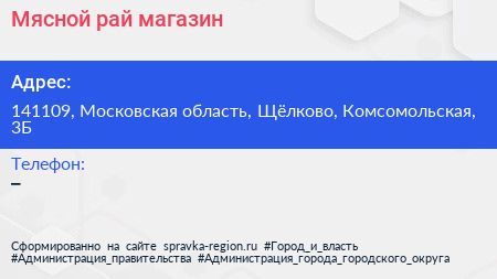 Мясной рай, магазин по адресу 141109, Московская область, Щёлково, Комсомольская, 3Б в дальнейшем Организация, размещена в следующих категориях: