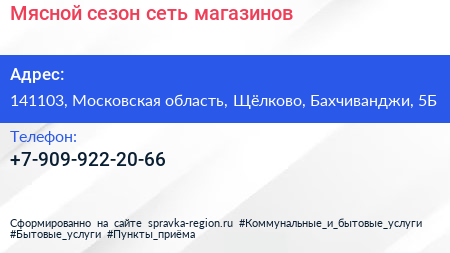 Мясной сезон, сеть магазинов по адресу 141103, Московская область, Щёлково, Бахчиванджи, 5Б в дальнейшем Организация, размещена в следующих категориях: