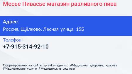 Месье Пивасье, магазин разливного пива по адресу Месье Пивасье, 15Б, улица Ватутина, КП "Лосиный парк", Валентиновка, Оболдино, городской округ Щёлково, Московская область, Центральный федеральный округ, 141181, Россия в дальнейшем Организация, размещена в следующих категориях: