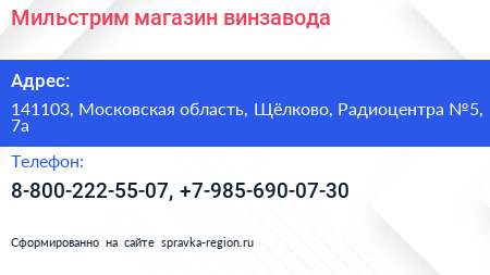 Мильстрим, магазин винзавода по адресу 141103, Московская область, Щёлково, Радиоцентра №5, 7а в дальнейшем Организация, размещена в следующих категориях: