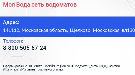 Моя Вода, сеть водоматов по адресу 141112, Московская область, Щёлково, Московская, вл130 в дальнейшем Организация, размещена в следующих категориях:
