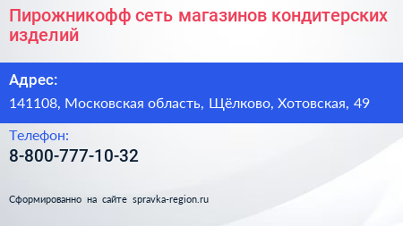 Пирожникофф, сеть магазинов кондитерских изделий по адресу 141108, Московская область, Щёлково, Хотовская, 49 в дальнейшем Организация, размещена в следующих категориях:
