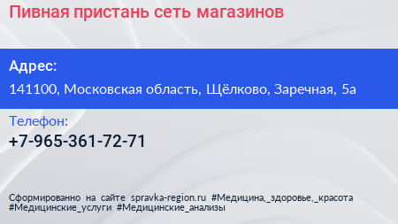 Пивная пристань, сеть магазинов по адресу 141100, Московская область, Щёлково, Заречная, 5а в дальнейшем Организация, размещена в следующих категориях: