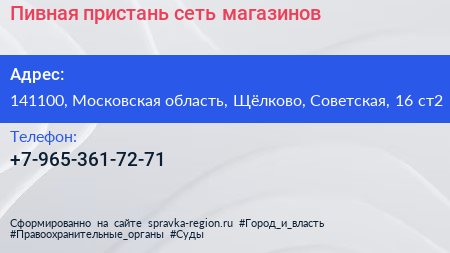 Пивная пристань, сеть магазинов по адресу 141100, Московская область, Щёлково, Советская, 16 ст2 в дальнейшем Организация, размещена в следующих категориях:
