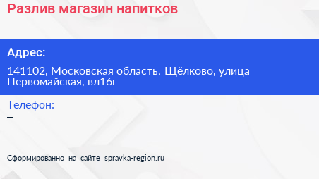 Разлив, магазин напитков по адресу 141102, Московская область, Щёлково, улица Первомайская, вл16г в дальнейшем Организация, размещена в следующих категориях: