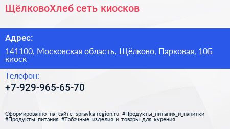 ЩёлковоХлеб, сеть киосков по адресу 141100, Московская область, Щёлково, Парковая, 10Б киоск в дальнейшем Организация, размещена в следующих категориях: