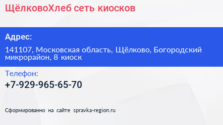 ЩёлковоХлеб, сеть киосков по адресу 141107, Московская область, Щёлково, Богородский микрорайон, 8 киоск в дальнейшем Организация, размещена в следующих категориях: