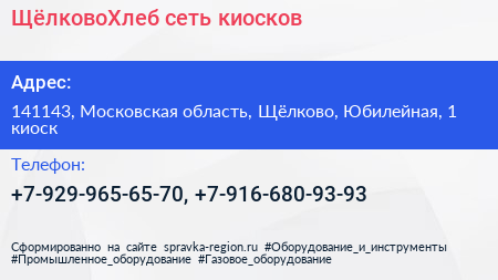 ЩёлковоХлеб, сеть киосков по адресу 141143, Московская область, Щёлково, Юбилейная, 1 киоск в дальнейшем Организация, размещена в следующих категориях: