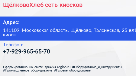 ЩёлковоХлеб, сеть киосков по адресу 141109, Московская область, Щёлково, Талсинская, 25 вл1 киоск в дальнейшем Организация, размещена в следующих категориях: